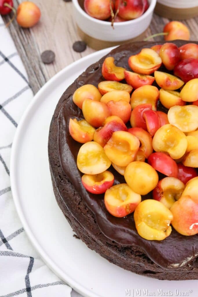 The best part is those macerated cherries you will spoon on top. We’re basically creating a quick and easy cherry compote by tossing them with sugar and letting them sit. The sugar draws out the natural juices, creating this light syrup that cuts through the richness of the chocolate. This makes the dessert feel less rich but still indulgent.
